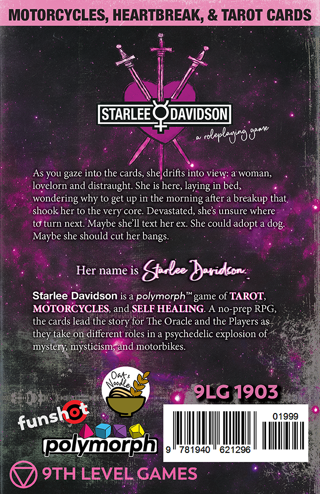 Starlee Davidson is a polymorph game of Tarot, Motorcycles, and Self Healing. A no prep TTRPG, the cards lead the story for The Oracle and the players as they take on different roles in a psychedelic explosion of mystery, mysticism, and motorbikes.